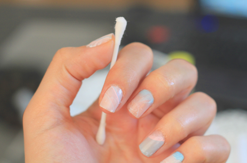 Pentru a face lucrurile mai interesante, am zis să fac un tip de marble nails foarte pastelate, cu roz, baby blue și un strop de alb.